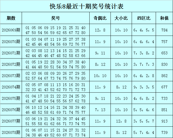 福彩风景8第2026078期开奖追思:01 06 07 11 15 21 24 27 31 32 34 38 46 49 52 60 67 71 73 74,其中奖号四区比为5:7:4:4,奇偶比为11:9,大小比为8:12,和值为739。