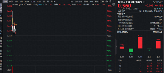 当天(4月3日)早盘,算力宗旨推崇活跃,要点布局国产AI产业链的科创东说念主工智能ETF华宝(589520)场内价钱现涨0.36%,值得关怀的是,该ETF昨天单日吸金674万元,拉万古辰来看,近20个来去日累计狂揽8312万元,反应资金看好国产AI赛说念后市推崇,逐步进场布局!