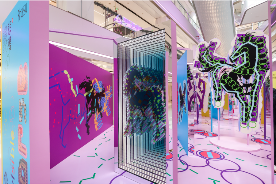中信泰富广场选取了徐悲鸿作品中数个最具代表性的马之形象为装置奠基,展览以六边形迷宫呈现,迷宫中心是一匹由线条、色块与镜像三者构成的立体骏马,于迷宫中行走,即是在以身体重新“书写”马的轨迹。