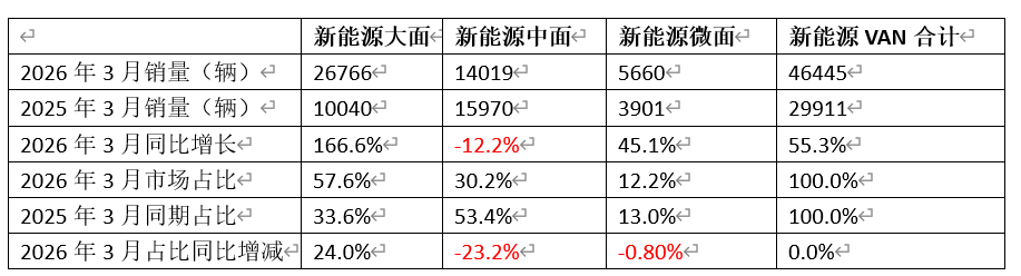 表1,把柄终局上牌数据,按车型长度及装载容积分别,2026年3月国内新动力VAN车型中的大面、中面和微面销量同等到占比、占比同比增减统计: