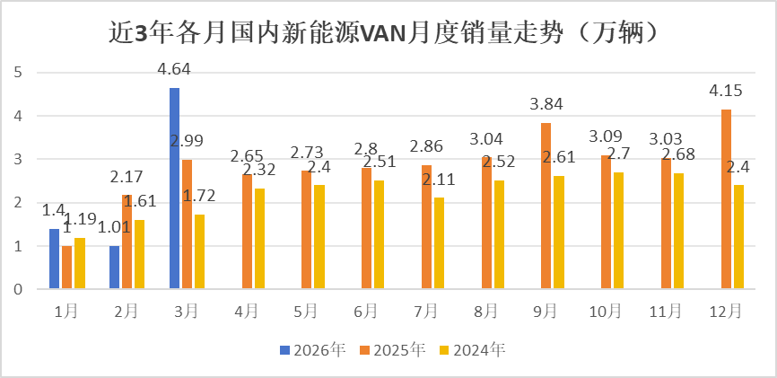 上图清晰,2026年3月国内新动力VAN销量4.64万辆,居近三年各月销量最岑岭,比第二高的2025年12月的4.15万辆还多出0.49万辆,也创下史上各月新高。