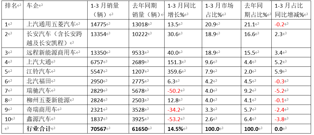 表3,2026年1-3月国内新动力VAN前10车企销量同比、市集占等到占比同比变化统计(数据起首:终局上牌)