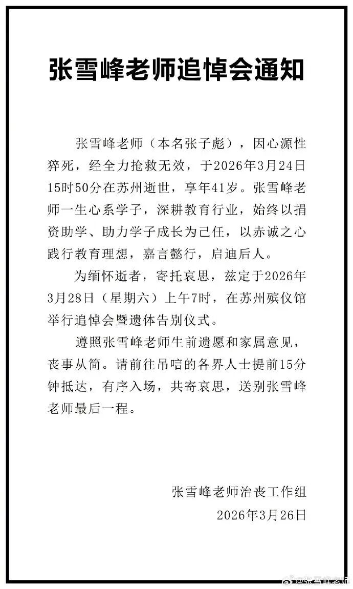 3月26日凌晨,微博账号@张雪峰古道发布音讯:将于3月28日(星期六)上昼7时在苏州殡仪馆举行追到会暨遗体告别庆典。不设回首会、祭品等悼念礼品,防止通盘单元及个东谈主专程前去家中、单元悼念慰问,“张雪峰家属充分尊重骸骨生前遗志,凶事一切检朴。”