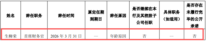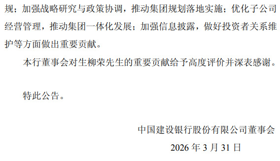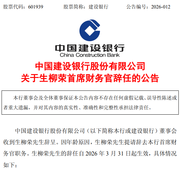 2026年4月1日,上交所主板上市公司缔造银行(601939.SH)发布了《对于生柳荣首席财务官辞任的公告》。公告泄露,因年纪原因,生柳荣先生提请辞去该行首席财务官职务。生柳荣先生的辞任自2026年3月31日起收效。
