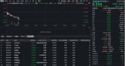 吃喝板块当天(4月3日)回调,反应吃喝板块全体走势的食物饮料ETF华宝(515710)开盘后轰动走弱,盘中场内价钱一度跌超1%,结尾发稿,跌0.89%。