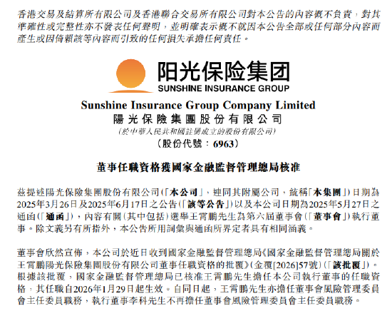 最佳策略1月30日金融一线消息,阳光保险发布公告称,广州期货配资公司于近日收到国家金融监督管理总局《国家金融监督管理总局关于王霄鹏阳光保险集团股份有限公司董事任职资格的批复》,国家金融监督管理总局已核准王霄鹏担任公司执行董事的任职资格,其任职自2026年1月29日起生效。自同日起,王霄鹏亦担任董事会风险管理委员会主任委员职务,执行董事李科不再担任董事会风险管理委员会主任委员职务。