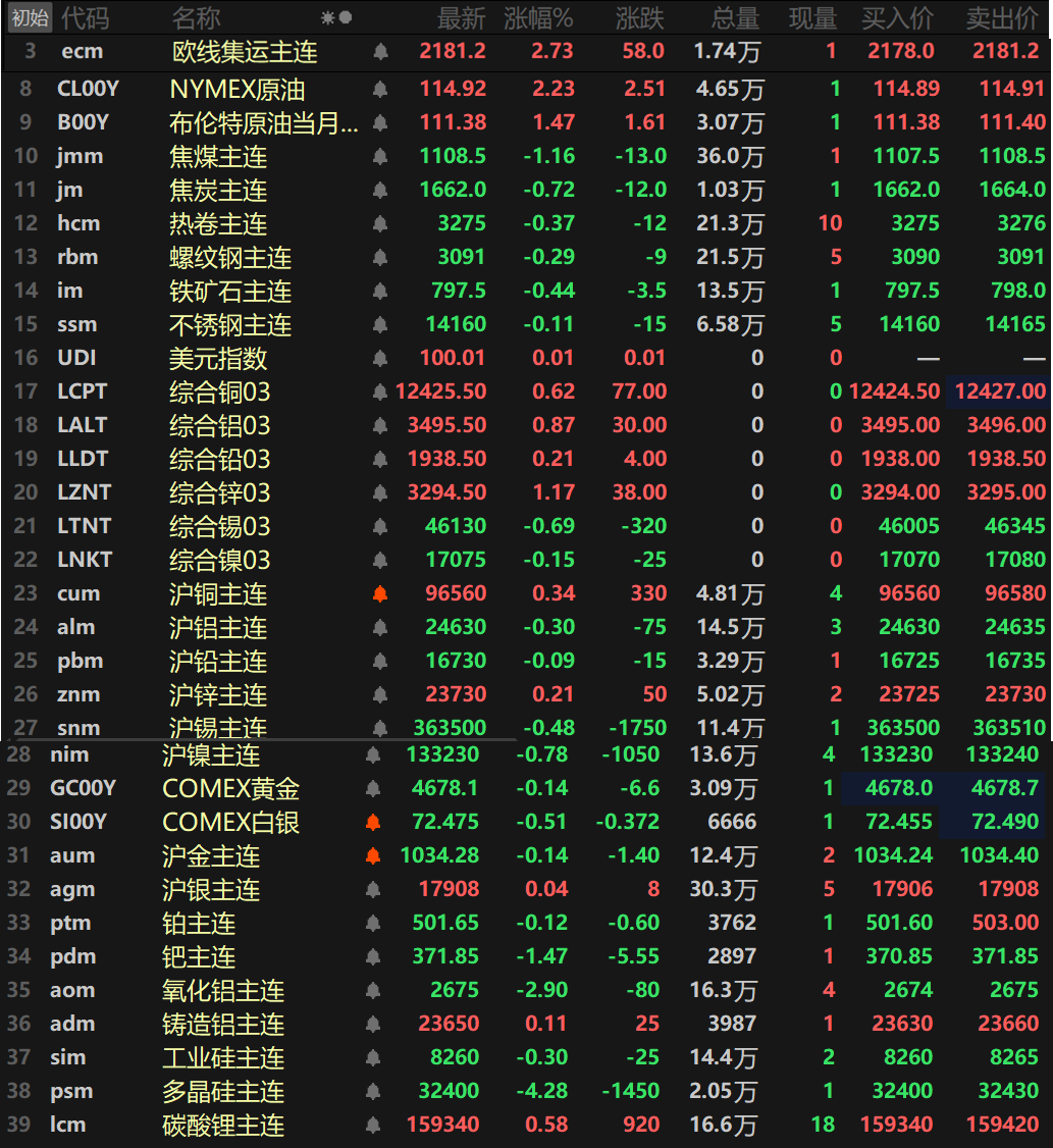 此外,碳酸锂主连涨0.58%,多晶硅跌4.28%,工业硅跌0.3%,欧线集运主连涨2.73%报2181.2。