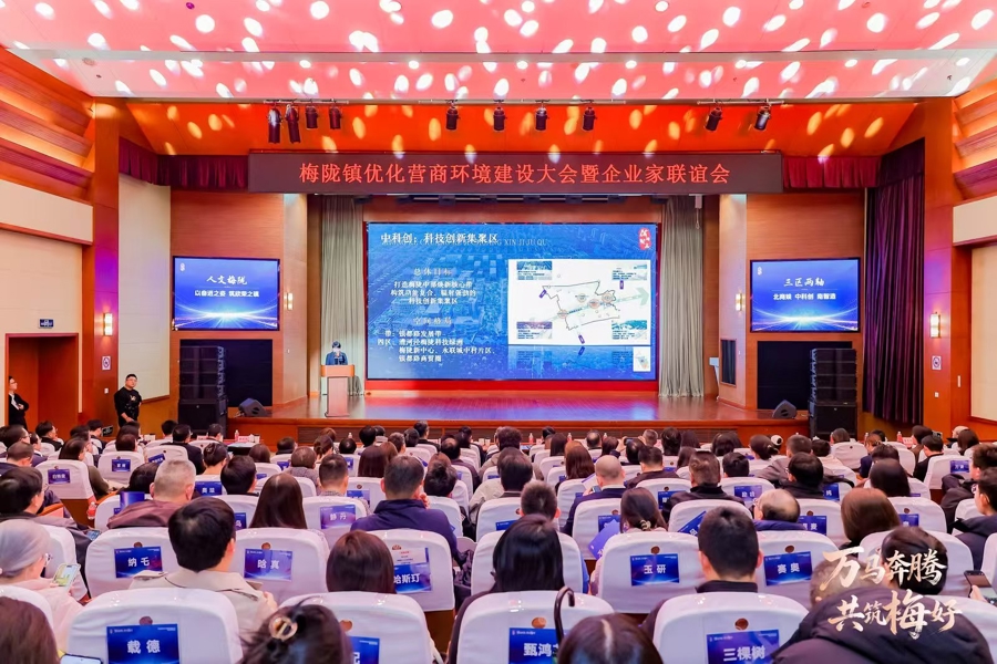 梅陇镇今天召开“万马奔腾,共筑‘梅’好”——2026年梅陇镇优化营商环境建设大会暨企业家联谊会。会上解读了《梅陇镇“十五五”规划》,为未来发展锚定方向;7家新入驻企业代表集体亮相,形成聚势,开启新程。