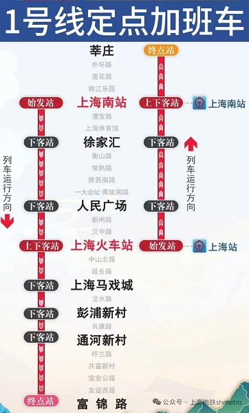 为运送“春运”集中到达的返程大客流,自2月21日起,地铁1、2、3、4、9、10号线将开行“多头班车”,其中,1、3、4号线上海火车站站,1、3号线上海南站站,2、10、17号线虹桥火车站站及9号线上海松江站站将在首班车前后视情况再投放载客列车,及时疏运铁路站守候地铁首班车的返程大客流。