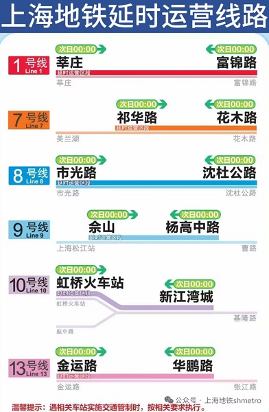 为满足“春运”期间乘客夜间出行需求,逢周五、周六,地铁1、7、8、9、10、13号线将继续执行常态周末延时运营方案。