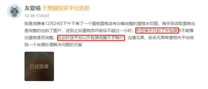 今年度,有糜掷者反应通过达达秒送配送蛋糕,商家出餐及骑手取货时均有像片证实蛋糕无缺。投递后蛋糕发生损毁,全程配送不及一小时,由于骑手请托时仅拍摄外包装无法看到里面是否有梗阻,糜掷者请求赔付却遭达达平台间隔。平台以“外包装完整”为由不予处理,经屡次交流投诉无果。