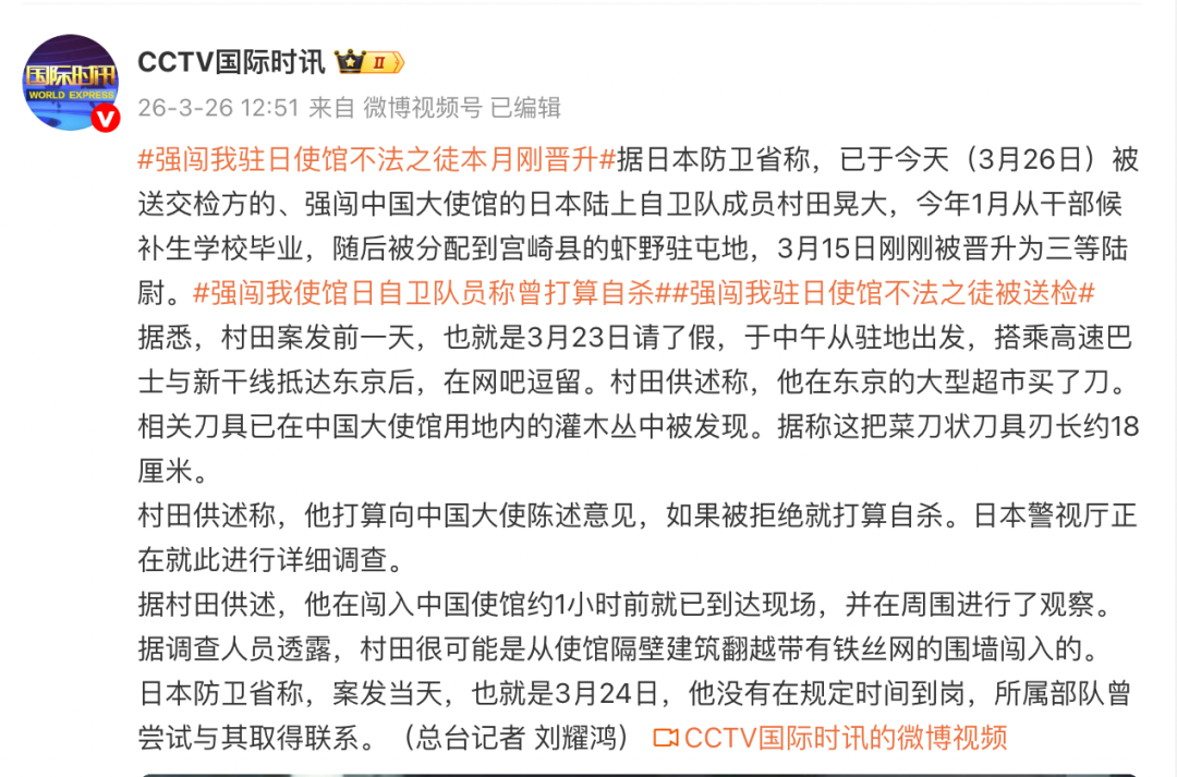 据日本看管省称,已至今天(3月26日)被送交检方的、强闯中国大使馆的日本陆上自保队成员村田晃大,本年1月从干部候补生学校毕业,随后被分派到宫崎县的虾野驻屯地,3月15日刚刚被进步为三等陆尉。